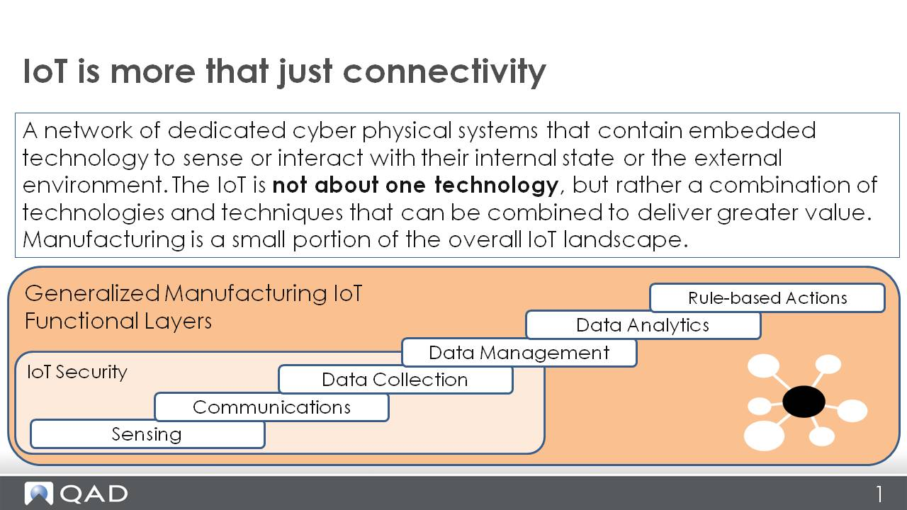 There is no singular approach to addressing these layers or functions. These layers will evolve, overlap and interact differently in nearly every IoT solution. There are various vendors of software and hardware solutions that can provide the individual layers or combinations thereof. Manufacturers will be or are already making these challenging choices and finding ways to drive value out from IoT initiatives.